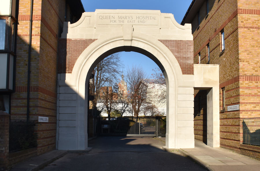 West Ham in east London was once a small country village but boomed in population during the later 19th century as London became industrialised. 300 new factories sprang up in the area, many of which were chemical factories and ironworks, in which accidents were common. A local Victorian dispensary was enlarged and expanded to become one of the most advanced hospitals of its time, with over 100 beds and bedside headphones for all patients. Queen Mary became the hospital’s Patron in 1917. During the First World War its wards were turned over to injured soldiers. New buildings, including a maternity wing, were added in 1923, approached through this grand new Art Deco entrance arch. In 1983, 35 years after becoming part of the NHS, the hospital was demolished for a housing development, and only the arch remains.